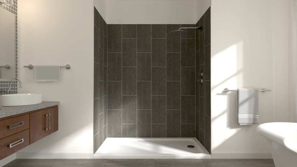 5-Piece Easy-up Adhesive Alcove Shower Surround in Grey Subway Mosaic Update the look of your bathroom with this Update the look of your bathroom with this JETCOAT Shower Wall System. White on black EPDM roofing membranes are now standard on 3 out of 4 new RVs. Update your bathroom with the Jetcoat Shower Update your bathroom with the Jetcoat Shower Wall Kit complete with Slate 5-piece shower walls and a white 60 in.